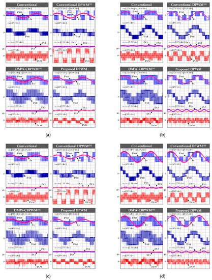 The proposed DPWM strategy is compared with the conventional CBPWM, the conventional DPWM [22] and the DMW-CBPWM [15]. Parameters of the experimental setup are listed in Table 6. When R = 10 Ω and L = 10 mH, the power factor cos φ is 0.954. When R = 10 Ω and L = 30 mH, the power factor cos φ is 0.732.