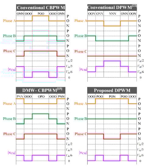 As shown in Figure 4, small vectors V13U and V13L are both used to synthesize the switching sequence. The switching state of these phases is all changed so that the switching sequence belongs to continuous PWM (CPWM). If only the small vector V13U is adopted, the switching sequence will become V13U–V14L–V0M (ONN–OON–OOO). While if only the small vector V13L is adopted, the switching sequence will become V14L–V0M–V13L (OON–OOO–POO). For the above two sequences, the switching states of phase A and C are both changed, but the switching state of phase B remains the same. Thus, these switching sequences belong to DPWM. By the use of DPWM, Only one of the redundant vectors appears in each carrier period. As a result, the switching loss can be reduced.