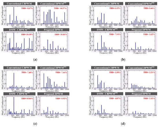 As shown in Figure 12, the output current ripple of DMW-CBPWM is the highest. The output current ripple of the other three strategies is not very different from each other. By the FFT analysis of the experimental results, the harmonics spectra of the output current waveforms under m = 0.3 and m = 0.8 are shown in Figure 14. Under lower modulation index and higher power factor conditions, the THD of the proposed DPWM is greater than Conventional CBPWM and Conventional DPWM but less than DMW-CBPWM. Under lower power factor conditions, regardless of the modulation index, the THD of the proposed DPWM is smaller than the other three strategies. Therefore, the output waveform quality of the inverter can be improved by the proposed DPWM strategy under certain load conditions.