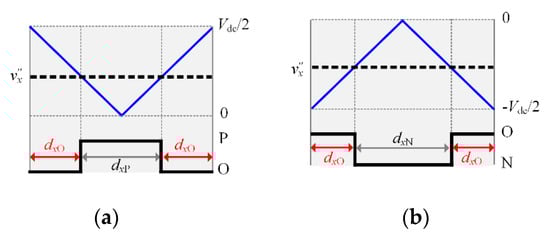 Duty cycles of switching state O of a certain phase in a unit carrier period. (a) condition of v″x > 0; (b) condition of v″x < 0.
