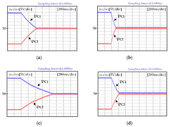 Capacitor voltage waveforms during the transition of the NPV balance control. (a) m = 0.3, cos θ = 0.954; (b) m = 0.8, cos θ = 0.954; (c) m = 0.3, cos θ = 0.732; (d) m = 0.3, cos θ = 0.732.