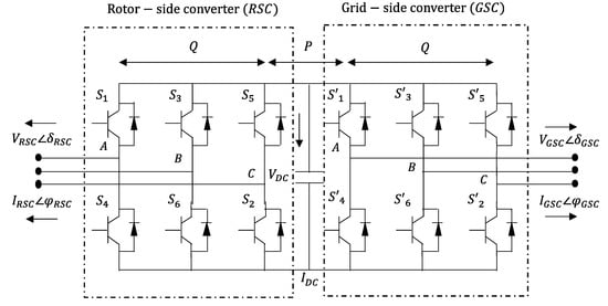 The B2B power converter consists of a rotor–side converter (RSC) and a grid–side converter (GSC) controlled by the PWM, which shares their continuous stage, making a bidirectional converter that is connected in series to a DC bus in parallel with a capacitor, as shown in Figure 1. The GSC controls the active and reactive power flows, keeping the voltage of the DC–link constant within certain limits. Conversely, the RSC controls the speed of rotation and its magnetic flux.
