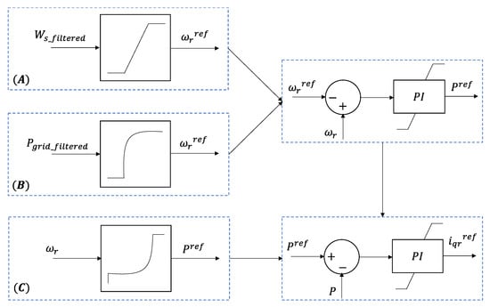 In Figure 2A, a first block is considered that has the filtered wind speed as an input signal to later obtain a reference signal for the rotation speed of the generator rotor, which is used to obtain the power reference, , with which the reference current for the q component of the rotor is finally generated. The relationship of each component with the active and reactive power depends on the orientation of the reference frame used. On the other hand, in Figure 2B the measured signal is the active power injected into the grid from the stator, to obtain through this and continue with the same blocks mentioned for the diagram of Figure 2A. Finally, Figure 2C shows the rotation speed of the generator rotor, generating, in turn, stator reference active power through a lookup table. There are also schemes that directly regulate the rotor speed and therefore omit the power regulation stage to obtain the reference current.