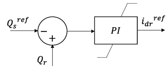 The reference current obtained from the process just described is used to determine the modulation indices of the power converter connected to the rotor and, in this way, generate the current necessary for the desired operation of the machine. The current can be obtained through a PI controller, as shown in Figure 2, or it can be calculated with an analytical expression that depends on the simplifications made in the model. The reactive power injected or absorbed at the stator terminals is controlled with component d of the three-phase rotor current. The implementation of a PI controller like the one shown in Figure 3 is sufficient to fulfill this objective.