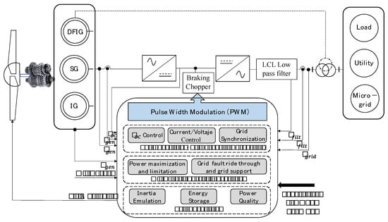 Currently, wind energy is the largest modern renewable technology, with more than 60 GW of installed power at the end of 2019, and it is the second source for obtaining electrical energy from renewable sources, behind hydroelectric [1]. At the end of 2019, wind power supplied about 7.5% of global demand for electrical energy, but at the end of 2006, it had supplied less than 1% with the United States, China, Germany, Spain, and India as the main global producers. By 2030, this type of clean and inexhaustible energy will represent the main source of electricity, and its strong growth will be supported by a multitude of new onshore wind turbine installations and the expected large-scale deployment of offshore wind turbines. This growth in electrical energy production has been achieved because of substantial advances in wind turbine manufacturing technology, such as the decrease in installation, operation, and maintenance costs. These together with the increase in the efficiency and availability of wind turbines have allowed a significant reduction in production costs. Currently, variable-speed wind turbines are usually constructed in two ways: directly by using an AC-AC conversion, such as that performed by cycloconverters, or by using converters with a DC-link for an AC–DC–AC conversion [2]. Variable-speed wind turbines are divided into two main categories according to their rotational speed: wind turbines with a wide speed variation range, and wind turbines with a low-speed variation range. The first turbines include squirrel-cage rotor asynchronous generators, permanent magnet synchronous generators, and wound rotor multipole synchronous generators that eliminate the gearbox [3]. For wind turbines with a low-speed variation range, stand out asynchronous and synchronous generators with a wound or doubly-fed rotor are used. The latter use power converters to interconnect to the electrical grid. There are different power converters that can be used in wind turbines: soft starter, uncontrolled rectifier, tandem converter, matrix, multilevel, and back-to-back (B2B) topology. The latter constitutes an extended and relatively inexpensive commercial solution for low power. It is worth mentioning that in all cases, the participation of the power converters is needed to adjust the frequency of the generated voltage to the grid frequency. Power converters are needed in almost all types of systems, that is, in classic energy systems, as well as in renewable energy systems, with the aim of controlling the renewable source (wind turbine, wave generators, photovoltaic panel, small hydro-electric power plants, fuel cells, etc.) and to interact with the load, which can operate both isolated from and interconnected to the electrical grid. Now, specifically for wind energy applications, the power level is normally high to reduce the price per kWh generated; therefore, the topologies of the three-phase power converter are dominant for the wind turbine system. A technical advantage offered by the B2B configuration is the relatively simple structure and the use of few components, which contributes to a well-proven robust and reliable performance. As the power and voltage levels increase, however, the B2B power converter may experience higher switching losses, lower efficiency, and higher generator and transformer voltages, as well as the use of large-capacity capacitors and their high cost, which can produce harmonic signals of the kHz order and inject them into the grid both at subsynchronous speed and supersynchronous speed, and even at synchronous speed, which degrade power quality according to the IEEE 519 standard.