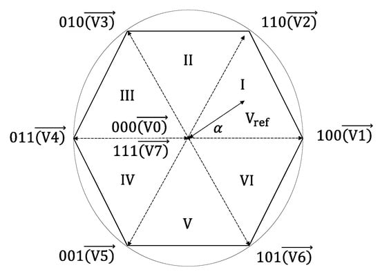 This switching technique performs evaluations of the three-phase reference system to find its resulting vector, which is located and averaged with its adjacent vectors, and to subsequently apply the resulting times of averaging to the appropriate switching sequences for delivering a three-phase sinusoidal voltage. After applying this switching sequence, the three-phase system is re-evaluated, and the sequence begins again. This switching technique applied in the RSC will allow lower harmonic distortion in the output voltages and currents to be obtained, as well as improving the use of the DC-link, obtaining better results than the SPWM switching technique. To implement this technique, it is necessary to know the voltage equations in the abc reference frame and to perform the transformation corresponding to the dq stationary reference frame. As a result of these transformations, we have six active vectors and two null vectors. Active vectors form the characteristic path of the SVPWM, and these vectors supply voltage to the load. The active vectors are separated from each other by 60°. The magnitude of the active vectors is (2⁄3). The null vectors are at the zero point of the complex plane, and they apply 0 V to the charge. For calculating the application time of the different vectors, it is necessary to know the system parameters, such as the switching period, DC-link level, and the offset α. The eight switching combinations correspond to eight stationary voltage vectors in space. The state diagram of six active voltage vectors , , , , , and and two zero voltage vectors and forms a hexagon. The voltage vector diagram of a two-level inverter is shown in Figure 8. The entire space in the two-level inverter is divided into six equal sectors, and the size of each sector is 60°. Each sector is bounded by two active vectors. The zero vectors are located at the origin of the hexagon.