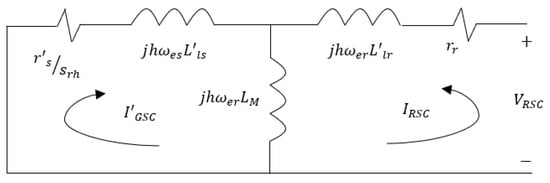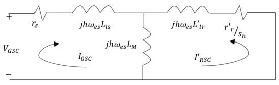 To obtain a complete view of the behavior of the machine with respect to the harmonic currents of the stator, first an appropriate equivalent circuit was developed in steady-state seen from the stator (as in Figure 9), which was established in the time-domain. Note that the DFIG was excited from the stator with a harmonic voltage at frequency , and the rotor was short-circuited. It should be taken into account that all the DFIG parameters are referred to the stator.