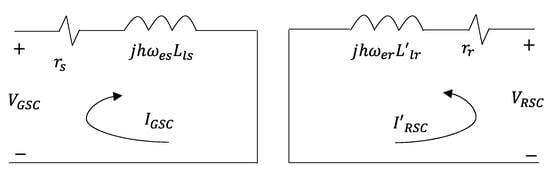 The harmonic slip equations for both the stator (2) and rotor (5) are used for harmonics that have the same behavior for both positive and negative sequences and are only valid under balanced conditions. For the case of the zero sequence, which corresponds to harmonics h = 3k, the circuit of Figure 10 is not valid because for the zero sequence the DFIG works with the two uncoupled windings, resulting in the circuit of Figure 11, where the voltage equations are represented as