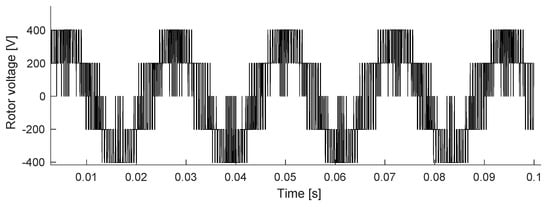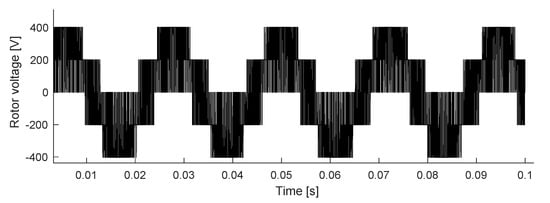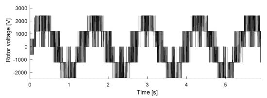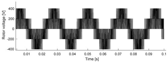 In order to have a more representative DFIG, in this case study a three-phase induction machine of 1.6 MW was considered. The DFIG parameters are shown in Table 10. A three-phase balanced voltage source of 2300 V and 60 Hz was applied in the stator, and a three-phase voltage source of 2300 V, 45 Hz was applied in the rotor. The switching technique applied to activate the RSC switches and generate the rotor voltage waveform shown in Figure 29 was SVPWM.