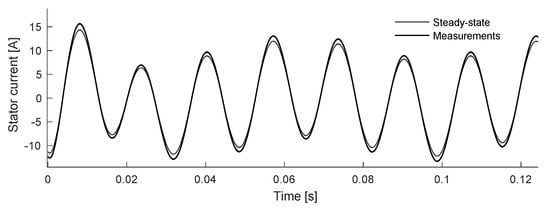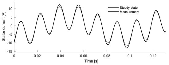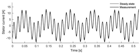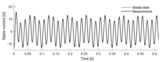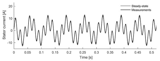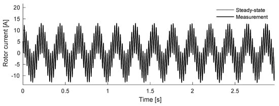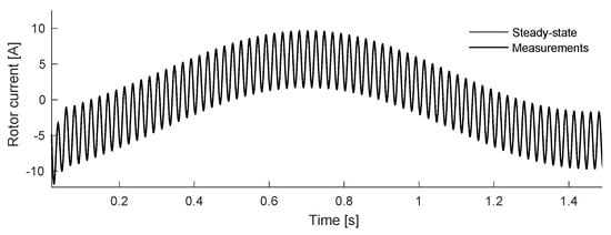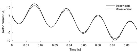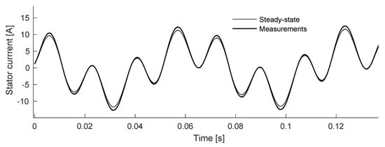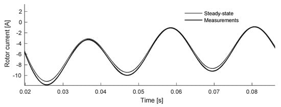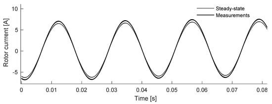 The harmonic components of the rotor voltage are listed in Table 6. Figure 20, Figure 21, Figure 22 and Figure 23 show the stator and rotor current waveforms, respectively. Both figures show the results obtained from the proposed model as well as those obtained experimentally.