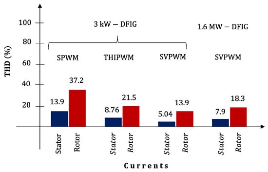 The frequencies at which these may appear are related to factors such as operating speed and supply power quality. Additionally, the analysis demonstrated that the harmonic voltages generated by the B2B power converter applying the SVPWM switching technique introduced harmonic components in the stator and rotor current and that, more importantly, they also gave rise to a number of further interharmonic current frequencies whose existence was DFIG design specific. Finally, Figure 32 presents a graphical comparison of the THD levels of the stator and rotor currents when implementing each of the previously mentioned switching techniques.