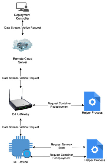 The IoT Gateway receives action requests from the cloud server and will route the request to their corresponding target devices or ignore the request entirely if it is required to execute it. The IoT gateway will communicate with the helper process if the gateway is the target for the redeployment request. When the helper process is notified it will proceed to handle managing, rebuilding, restarting and deleting of containers and images for a seamlessly migration to the newer version. The IoT gateway receives the data stream and forwards it to the cloud server.