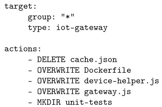 IoT-edge Deployments are described through YAML configuration files. Redeployment requests must have the build.yml file at the root of the update folder. The updated folder is located at /update of the current working directory of the deployment controller. The structure of the build file is illustrated in Figure 3.