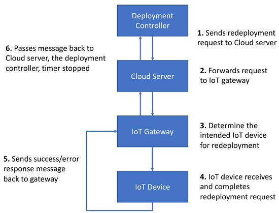 Redeployment time is the overall duration for the following actions to occur: deployment controller sends redeployment request to the IoT gateway. IoT gateways verifies the IoT devices to forward the request to. IoT device receives and complete the redeployment request. IoT device sends success of failure message back to the IoT gateway. IoT gateway checks if the redeployment request was successful and if it has failed it will request for the IoT device to perform the redeployment request again. Upon success of the redeployment request the IoT gateway will pass the message back to the deployment controller and the timer is stopped and time taken is displayed.