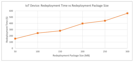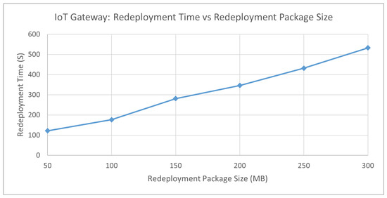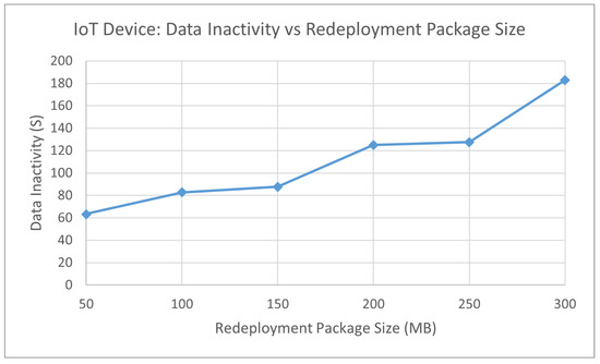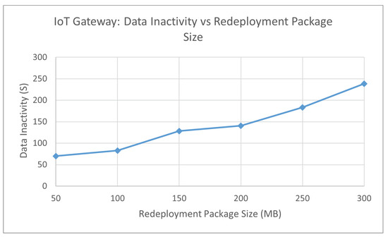 Figure 7 displays a relatively linear trend where the larger the redeployment package, the greater time, no data are sent from the IoT devices to the IoT gateways. The time difference between each 100 MB redeployment package size is greater than 40 s, whereas the jump between 50 MB is relatively stagnant.