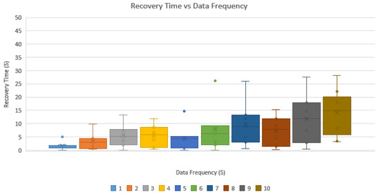 Figure 11 is a demonstration of the time increasing for the IoT device to recover from sensor failure when the time between messages is increased with 10 s having the largest spread of varying recovery times. The 5 s interval for Figure 11 contains the smallest spread due to the fact that messages are being sent every 5 s to the IoT gateway and the IoT gateway itself was configured to check for problems with the IoT device every 5 s. There is a clear distinction that increasing the frequency at which data are sent allows for a much quicker recovery time with a smaller spread.
