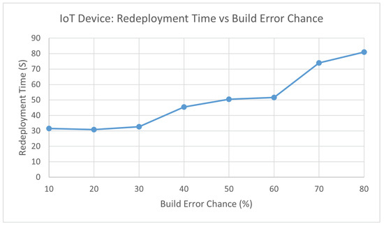 Figure 9 displays a very linear trend that a larger build package sent across the network will increase the time it takes for the redeployment request to be fulfilled. At a 50 MB redeployment package, it takes approximately 110 s for a successful redeploy and a 100 MB redeployment package on average requires 185 s. The time difference between each 50 MB increase in the redeployment package size is approximately 80 to 90 s.