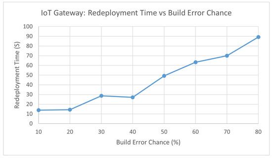 Figure 13 shows that the redeploy time is not greatly affected when the chance of a build error occurring is lower than 30 percent. The redeployment time begins to have a major increase from 40 percent chance of build error and does not slow down. Results indicate that minimising the build error as much as possible for the gateway will ensure quality of service for end users will not be tarnished.