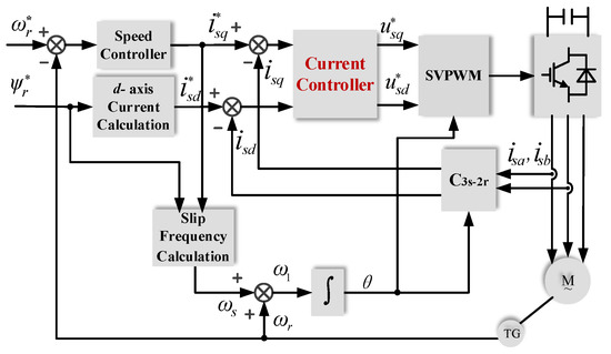 Induction motors (IMs) are widely used in the industry due to their simple structure, fast dynamic response, low moment of inertia, low torque ripple, high reliability, and low costs of manufacture, repair, and maintenance. Particularly because of the multifarious advantages in handling large voltages and currents, the induction motor continues to be a preferred choice for multimegawatt, medium-voltage applications [1,2,3]. To achieve better dynamic performance, more complex and sophisticated techniques were proposed to control the motor [4]. These techniques include Field Oriented Control (FOC) [5], Direct Torque Control (DTC) [6], and Indirect Stator Control (ISC) [7]. Field Oriented Control is the most popular vector control method [8]. Previous studies have shown that due to its high efficiency in controlling the induction motor, this vector control method is by far the most widely used control scheme [9,10]. As shown in Figure 1, FOC is implemented by modulating the torque component and field component of the stator current (isq and isq) separately, through a synchronized change in supply voltage (usq and usq) amplitudes, phase, and frequency [11]. FOC decomposes the stator current into mutually perpendicular excitation current and torque current, thus realizing independent regulating of flux and torque. Nevertheless, there is cross-coupling in the FOC, consisting of two parts, i.e., the cross-coupling drawn on the stator side by the rotating coordinate transformation and the coupling of the back electromotive force (EMF) [12].