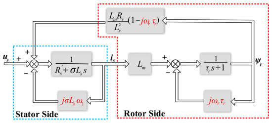 where, , is the synchronous angular frequency, is the rotor angular frequency, and is the slip angular frequency. According to (13), the motor voltage equation in the synchronous rotation coordinate system contains the cross-coupling component and the back-EMF component . The signal flow diagram of the induction motor in the dq-frame can be illustrated by Figure 2. Coupling parts are caused by the complex factor j. The imaginary part of a complex transfer function determines the degree of current cross-coupling [25]. As shown, there is a coupling factor in the feed-back loop at the rotor side. Generally, the value of the slip angle frequency in the whole speed range is tiny. The value of the rotor time constant is also small. Therefore, the influence of this part of coupling on the motor’s dynamic performance can be ignored.