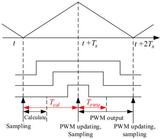 The code execution of control algorithms needs to be completed in advance of the updating of modulated wave data. In other words, the signal processing should be completed before entering the next time step. If we define the current sampling period as then the delay time caused by digital control () equals .
