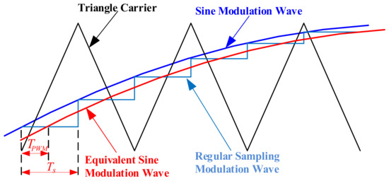 Additionally, the phase delay caused by regular asymmetric sampling is shown in Figure 4. The PWM signal to update is generated during the time interval between two sampling points. An equivalent sine wave can be used to analyze the delay impact caused by PWM modulation. The equivalent sine modulation wave phase is about half a sampling cycle behind the standard sine modulation wave. Therefore, the PWM phase delay caused by the asymmetric regular sampling modulation process is half a sampling period . Therefore, the total delay time of the digital control system is .