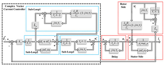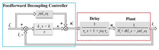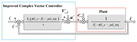 The two current controllers analyzed above are based on the simplified motor model (see Equation (20)), where the back-EMF coupling component is considered an external disturbance. However, with the increase in the motor speed, the EMF component gradually increases. As such, this coupling part should not be ignored. The accurate mathematical model of the induction motor, which considers all the coupling factors, can be employed to design a current controller contributing more thoroughly to the decoupling effect. When the delay link is taken further into account, the complex vector transfer function becomes: