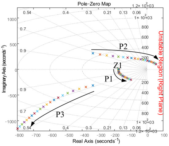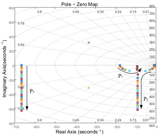Figure 8 illustrates the zero-pole map of the system. It has one zero and three poles. When the speed is zero, the system is not coupled (P2 and P3 are symmetrical about the real axis). With the synchronization frequency increasing, the poles P2 and P3 are no longer symmetrical to each other about the real axis. Both the pole P1 and the zero Z1 move towards the imaginary axis with the increasing synchronous frequency. Furthermore, Z1 cannot fully offset P1. When the synchronous frequency is high enough, P1 appears at the right unstable region. The system stability is disturbed. Therefore, the feed-forward decoupling has its limitation.