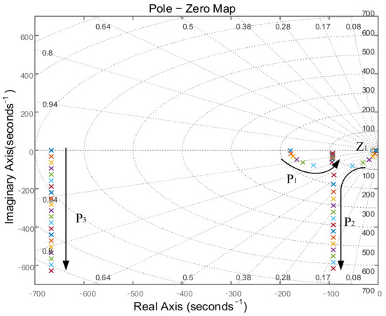 After employing the complex vector current control of (24), the zero-pole distribution of the closed-loop transfer function of the system is shown in Figure 13. By comparing Figure 12 and Figure 13, it can be seen that, except for two conjugate poles, all the other complex poles are offset by the zeros introduced by the complex vector current controller. The complete decoupling is hence realized. The open-loop transfer function of the system can be expressed as: