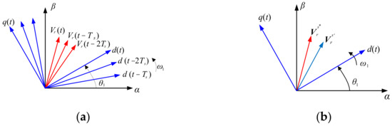 Regarding the space vector pulsed width modulation (SVPWM), due to the presence of digital delay, the voltage space vector (taking a common vector Vr for example) sampled at time t would not act on the power hardware until it enters the time interval between t + Ts and t + 2Ts. Such an effect can also be stated as follow: when the reference space vector is aligned with Vr(t), the acting space vector is actually located inside the sector between Vr (t − Ts) and Vr (t − 2Ts), as shown in Figure 14a. Note that the superscript () is used to indicate the variable is in the static frame (αβ). Another superscript () will be used to indicate the variable is the synchronous frame (dq) in the following analysis.