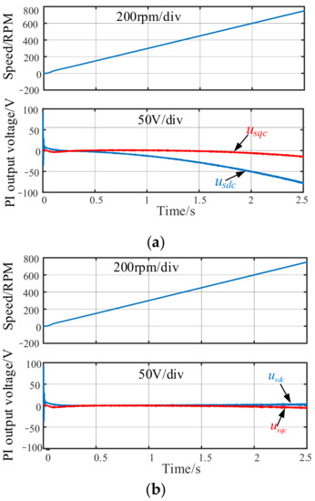 Figure 16 shows the relationships of the output voltage commands of the current PI controller with regarding to the increase of the motor speed with/ without imposing the delay compensation strategy expressed in (28). In the figure, and are the d- and q-axis command components generated by the current PI controller. The larger the values of , are, the more significant the voltage error caused by the delay is. Back to Figure 16a, the values get larger with the increase of the motor speed, indicating that the higher the speed is, the greater the output voltage error is. In contrast, after adopting the delay compensation strategy, both values remain near 0, as shown in Figure 16b. Hence, the delay compensation strategy adopted can effectively compensate for the voltage error caused by the digital delay.