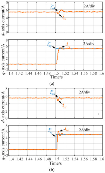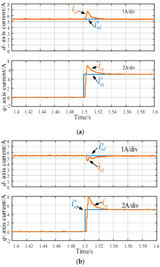 Step response of currents: (a) Feed-forward controller with delay compensation; (b) Improved complex vector control.