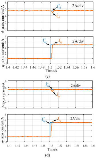 Figure 21a–d provide their corresponding dq-axis current response curves. No matter with any of the four cases, little difference can be observed compared with the accurate one in Figure 20a, which indicates these inaccurate parameter estimations do not affect the decoupling performance. Therefore, the decoupling control scheme proposed in this paper has considerable parameter robustness.