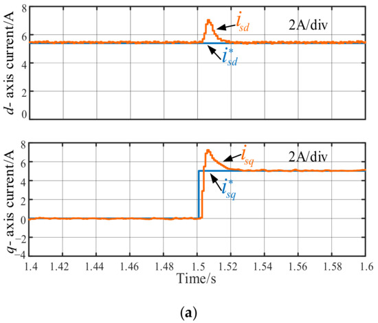 However, the q-axis current overshot is larger, indicating that the dq-axis current coupling is still serious. Finally, Figure 29 shows the experimental waveforms of the improved complex vector control scheme proposed in this paper. It can be seen that when the q-axis current step changes, the d-axis current is only slightly disturbed, and the command value is quickly tracked; there was no significant overshoot of the q-axis current either. Compared with the previous control schemes, the system response speed was faster, indicating that the complex vector control scheme has a better decoupling effect and better dynamic performance.