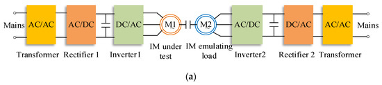 To investigate the effectiveness of the proposed control method, experiments were conducted with two 3 kW induction motors and their drive systems. Two inverter-motor systems are coaxially connected, as shown in Figure 25a. One IM (M1) serves as the motor under test. Another IM (M2) is used to emulate a load. Specifically, M2 stabilizes the speed at a constant value of 400 rpm. When the speed is stable, a command torque current of 5 A is suddenly added onto M1. Once the excitation current reaches stable status, the torque current changes from 0 A to 5 A in a step. Both drive systems are in a back-to-back configuration, as shown in Figure 25b and Figure 26. The Experiment parameters are the same as shown in Table 1.