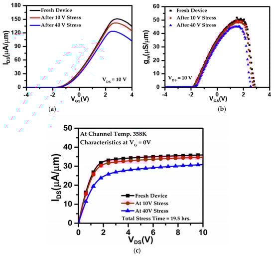 (a,b) Transfer characteristics shown for different stressed conditions of the device at a fixed channel temperature of 358 K. (c) Output characteristics demonstrated based on 15% Idss degradation of the device and total stressed time of 19.5 h.