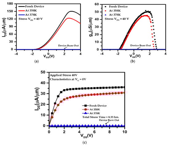 Figure 2b shows the output characteristics of the device at a channel temperature of 358 K under the open-channel condition Vgs = 0 V. Fresh device performance was also measured without any stress as 35 μA/μm in the saturation region. After applying 10 V of stress for 19.5 h, the output current drops by about 3.36%. Without changing the channel temperature, if 40 V of stress is applied to another device with the same gate length, then a 15% degradation of Idss is observed. The transfer characteristics (Figure 2a) of this device show similar drain current degradations. The transconductance (gm) degraded in a similar manner and consistency. On the other hand, tests were conducted with two different stress voltages (10 V and 40 V) separately on the same device at different channel temperatures. Figure 3 shows only two channel temperatures (358 K and 378 K) for the 40 V stress tests. The other tests show similar trends. Increasing the channel temperature to 378 K at 40 V stress completely burns out the device after 8.33 h. Owing to the high electric field and temperature, the device degraded critically. The parameter degradations for all temperatures and stresses are presented in Table 1.