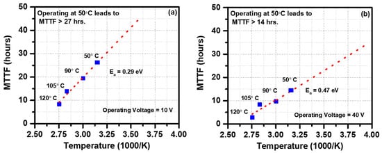 Figure 4 shows the MTTF for each temperature in terms of the Arrhenius plot and reveals activation energies of 0.29 eV and 0.47 eV for operating voltages of 10 V and 40 V, respectively. When both curves are extrapolated to the typical temperature of 50 °C, MTTF values exceeding 25 h and 15 h are predicted. Lifetime degradations are observed when the operating voltage conditions are changed. Therefore, using only the operating voltage condition is insufficient for predicting the MTTF values of AlGaN/GaN devices. The calculated activation energy according to the Arrhenius plot increases by 0.2 eV, thus enhancing the voltage condition.