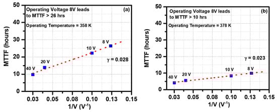 In Figure 5, separate experimental results are shown when varying two different channel temperatures to observe the voltage as an acceleration factor. Operating channel temperatures of 358 K and 378 K at three different voltage conditions (10 V, 20 V, and 40 V) are used to predict the MTTF values at 8 V as exceeding 26 h and 10 h, respectively. The voltage acceleration factors (γ) calculated from the power law are 0.028 and 0.023 for the two temperatures. The voltage acceleration factor thus decreases when the operating channel temperature increases.