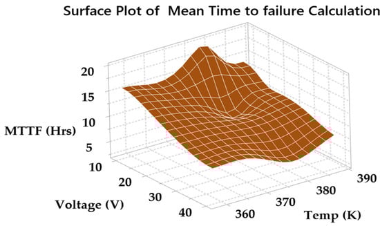 The total surface plot of the MTTF calculations are presented in a 3D format in Figure 6. This graph represents a part of our experimental results. Plotting the operating voltage along the X-axis, the operating channel temperature along the Y-axis, and MTTF (h) along the Z-axis presents an apparent picture of the MTTF; this graph shows the real picture according to the Eyring model for multiple stresses and channel temperature values affecting MTTF calculations. At a moderate voltage value (between 20 V and 30 V) for a temperature of 380 K, the failure mode of the device is observed to fluctuate more. Normally, at low voltages (less than 10 V), the MTTF values exceed 15 h. Theoretically, at 360 K and 10 V, the device’s MTTF should be at its highest (maxima point). MTTF should be low at 390 K and 40 V (Minima). Practically, the device characteristics vary from one device to another. In Figure 6, at a 380 K temperature and at the corresponding 10 V and 20 V, respectively, both maxima and minima were found, respectively. At 380 K at 20 V, early device degradation was found, which is rarely found at other temperatures. We use two distributions, namely the Weibull and log-normal distributions, to calculate the cumulative failure (%) of the devices using Minitab software. These results are depicted in Figure 7. The relationships between the accelerating factors of temperature (K) and voltage (V), as well as Ln (Power), are shown for the Arrhenius model. The devices with Idss reductions that exceed 15% have a count value of 1 and those with reductions below 15% have a count of 0 in the censoring data.