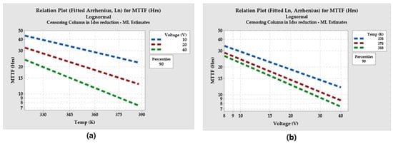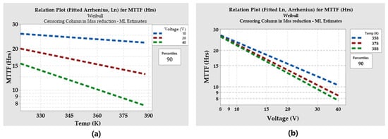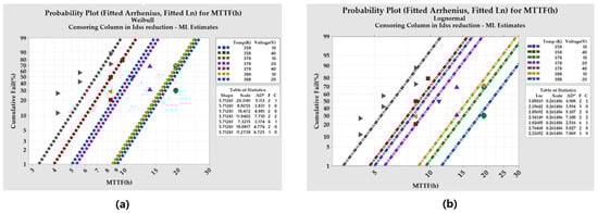 Table 2 showing the results of 22 devices, according to their failure times for three different channel temperatures and operating voltages for each one. In both distributions, the estimation method used is the maximum likelihood criterion. At each accelerating level, the software uses the Anderson–Darling (adjusted) goodness-of-fit, and the simulated results of the two test criteria are shown in Figure 8. The two plots show completely different MTTF values. In Figure 8b, at a low voltage level, the temperature effects are low, such that increasing the channel temperature does not change the MTTF much. Considering only the operating voltage as the acceleration factor is thus misleading for calculating the MTTF. The confidence level is considered as the 90% interval. The other distribution (log-normal) shows slightly different results. Figure 7b shows the log-normal distributions of the same samples, and the simulated results of the separate tests are plotted in Figure 9.