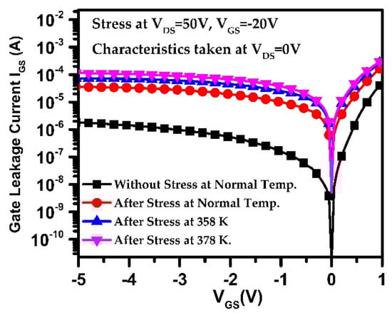 We observed sudden degradations in the devices and therefore focused on analysis of the gate leakage current characteristics [30,31]. In this experiment, the devices were stressed in the deep-pinched-off region (Vds = 50 V, Vgs = −20 V) (Figure 10). At ambient temperature, the forward gate current towards Vg = 0 V increases after deterioration. Then, a gate leakage path developed through the interface states during the stress tests, as indicated by the increase in gate current. The forward gate current increases before the stress test around 0 V in the high-temperature measurements. Thus, the gate leakage path at high temperature could be the source of this degradation. Hence, this research suggests that evaluating gate leakage currents at ambient temperature could be used to screen for early device failures.