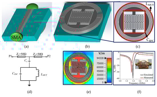 The proposed microwave sensor for measuring materials’ dielectric and thickness properties is designed using a parallel interdigital structure and the symmetrical differential bridge-type inductor. The fingers strip with its gap of the parallel combination of the interdigital structure is employed to achieve a high e-field zone. A differential bridge-type inductor is used to attain high mutual inductance. The designed sensor’s 3D geometry is shown in Figure 1, and the equivalent circuit with its field distribution at 1.38 GHz (see Figure 1f) resonance frequency is depicted in Figure 1d, e, respectively. The proposed microwave sensor resonating frequency () depends on the capacitance and inductance of the design, and can be defined as [28]: