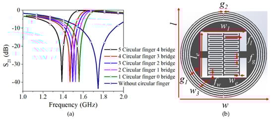 The proposed design inductor and capacitor value are optimized to attain a lower resonating frequency. The developed sensor interdigital structure generates a high e-field for measuring the sample’s thickness and dielectric properties more accurately with an air gap of 0.3 mm. The different bridge-type inductor is introduced to attain high inductance and lower tunable resonating frequency. The inductance increases with each circular ring included in the bridge structure, and the resonating frequency of the proposed microwave sensor decreases, as shown in Figure 3a. In the CST software, the minimum and maximum values of the different parameters are considered, and the setup solver provides the optimized values of the designed sensor structure. Various parameters of the proposed microwave sensor are optimized (see Figure 3b), as shown in Table 1 (all unit values are mm).