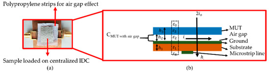 The proposed microwave sensor detects the complex permittivity and thickness with a gap of 0.3 mm between the resonator and testing MUTs. An air gap scenario is considered an extra layer with an unknown thickness and free space permittivity after loading the MUT on the resonator, as shown in Figure 4b. The alteration in the permittivity and thickness of a testing sample is associated with the resonance frequencies; the air gap between the testing MUT and sample influences the measured result. The polypropylene strip is used for the gap between testing MUTs and resonators, as shown in Figure 4a. The final mapping of the air gap situation between the resonator and testing sample is shown in Figure 4b.