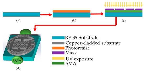 The proposed microwave sensor is fabricated by using the photolithographic process, as shown in Figure 5. First, a substrate (RF-35) with a height of 0.76 mm and coated with a copper layer of 35 μm thickness on both sides is taken, as shown in Figure 5a. The film’s backside contains the circular fingers inductor and interdigital structure covered with the negative photoresist uniformly. The film is passed through the heated feed rollers for removing vacuum, as shown in Figure 5b. The designed sensor mask is generated by transferring the circular fingers inductor and interdigital structure decoration onto a photographic film with the backing of a photoresist. The prepared cover is examined sensibly without any flaw and placed on the substrate, as shown in Figure 5c. The film with the mask is prebaked in a hotplate at 120 °C for 120 min. This is just for densification of the photoresist layer through evaporating the coating solvent in a hotplate. The entire design is exposed to ultra-violet (UV) light to convey the pattern, as shown in Figure 5c. Finally, with the help of an etchant solution, the unwanted copper is removed gradually, and the photoresist layer is also appropriately removed via acetone. The proposed design is excited by using the SMA connectors at the input and output ports of the microstrip line, as shown in Figure 5d. The designed microwave sensor’s good conductivity and reliability can be verified during the measurement process by encapsulating both connectors with UV light. In the designed microwave sensor, the microstrip line is utilized to attain a 50-ohm characteristic matching impedance.