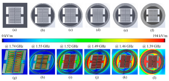 Proposed microwave sensor with e-field distribution at the lower tunable resonant frequency; (a) designed sensor without a circular finger; (b) with one circular finger; (c) with two circular fingers and one bridge-type structure; (d) with three circular fingers and two bridge-type structure; (e) with four circular fingers and three bridge-type structure; (f) with five circular fingers and four bridge-type structure; (g) e-field at 1.74 GHz; (h) 1.55 GHz; (i) 1.52 GHz; (j) 1.49 GHz; (k) 1.46 GHz; and (l) 1.38 GHz.