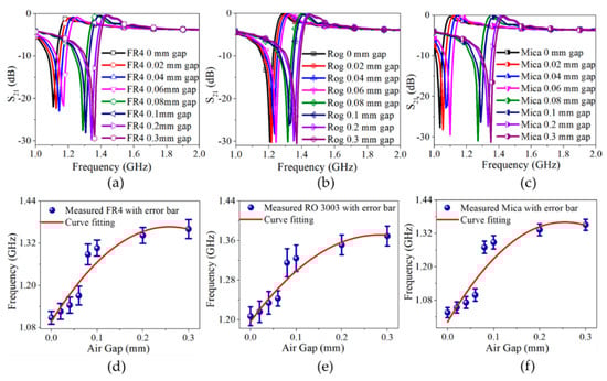 |S21|measured analysis of different permittivity MUTs loaded on the high e-field centralized IDC structure with varying air gaps ranging from 0.01–0.3 mm; (a) FR4 MUT; (b) rogers RO3003 (Rog) MUT; (c) mica MUT curve fitting technique analysis with error bars for the triplicate measurement of testing MUTs with varying air gap scenario; (d) FR4; (e) rogers RO3003; and (f) mica.