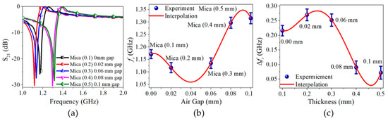 Equation (20) defines that if the tested variable is the resonating frequency, then the polynomial interpolation between the measured sample with a varying air gap can be graphically depicted in Figure 8b. Similarly, Equation (21) exhibits the relationship between the total variation in the resonance frequency and mica thickness after loading it on the designed sensor with varying air gaps, as explained in Figure 8c.