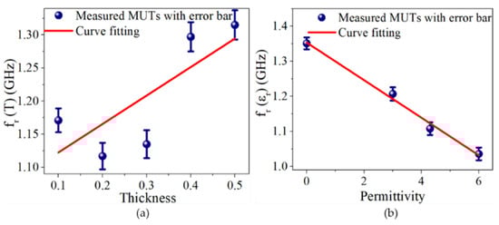The linear regression analysis was performed between the loaded sample (permittivity and thickness MUTs) and measured resonating frequency, prepared to calibrate the sensor. The designed sensor indicated a linear response with a good correlation coefficient (r2 = 0.91567 for thickness and r2 = 0.98903 for permittivity MUTs). It can be defined using the following regression equations (Equations (23) and (24)) for thickness and permittivity of the samples, as shown in Figure 10a,b.